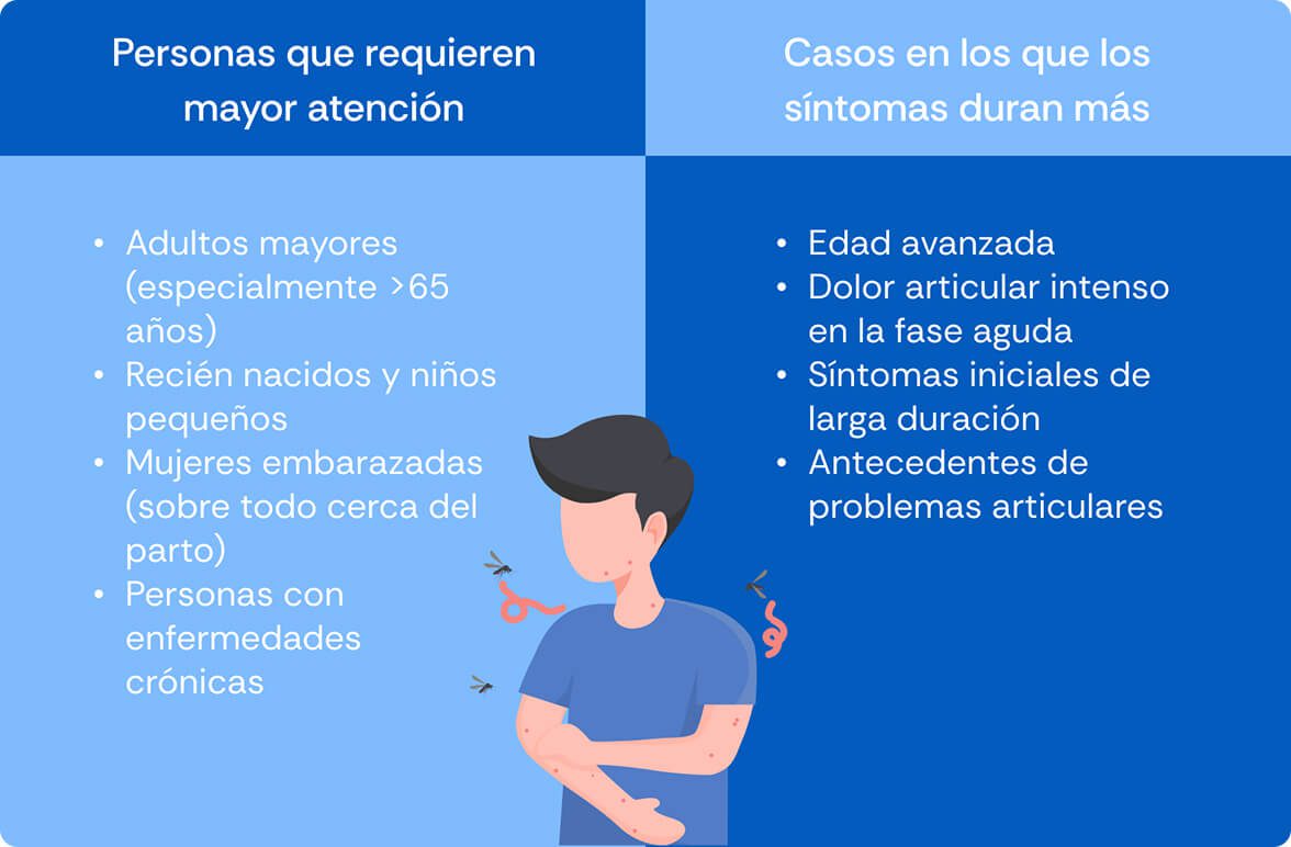 Cualquier persona puede contraer chikungunya; sin embargo, existen grupos que requieren mayor atención médica, ya sea porque tienen más riesgo de presentar complicaciones o porque los síntomas, especialmente el dolor articular, pueden prolongarse por más tiempo.