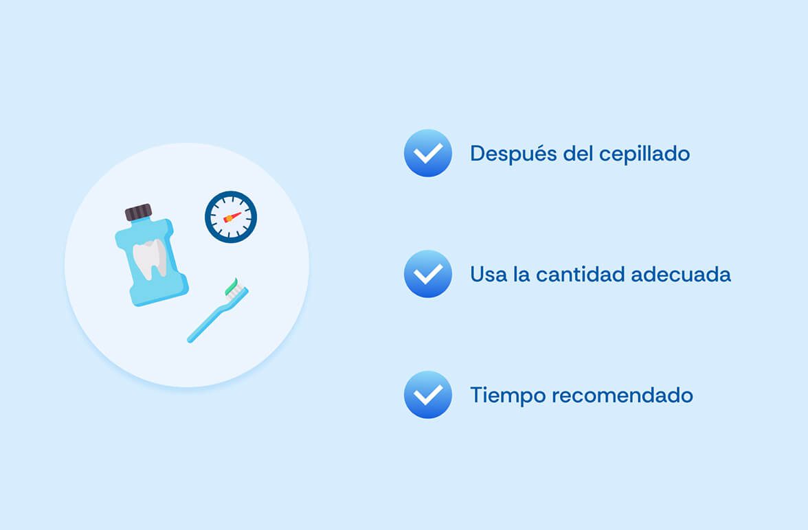 El enjuague bucal funciona mejor cuando se usa de la forma adecuada y como complemento; no como reemplazo del cepillado y el hilo dental. Para aprovecharlo correctamente, ten en cuenta estos pasos: