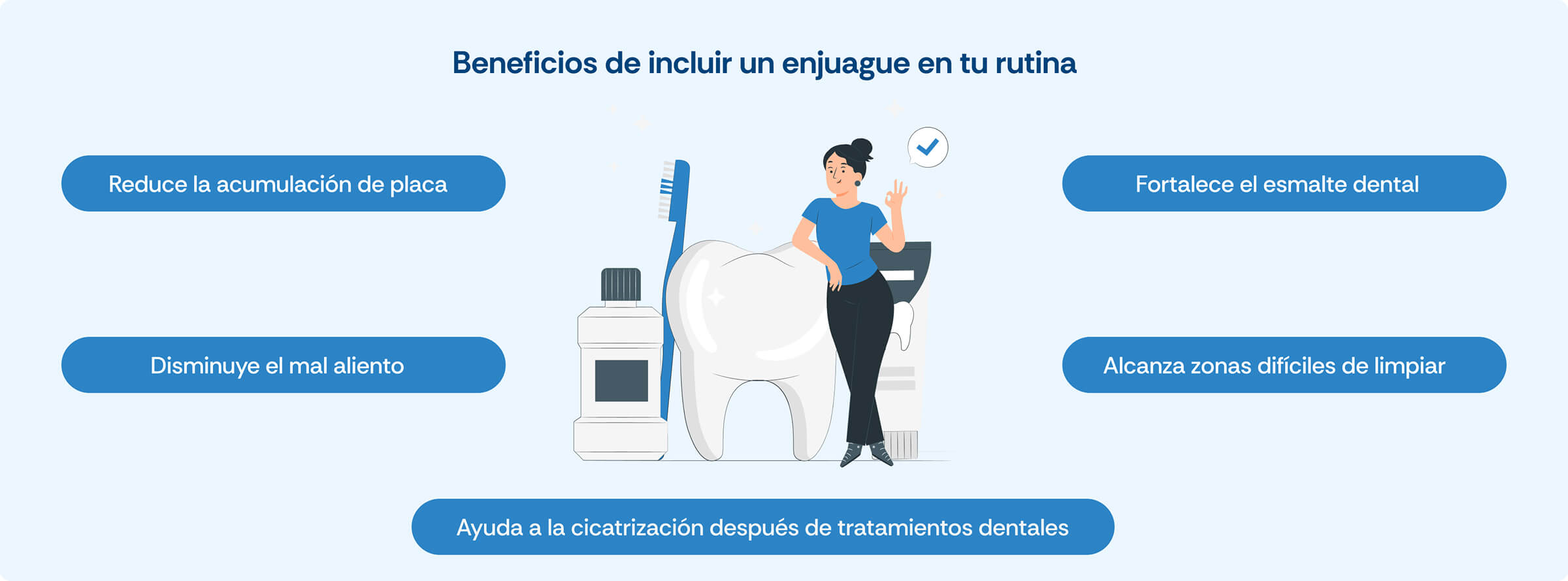 Un enjuague bucal no reemplaza el cepillado ni el hilo dental, pero sí puede ayudarte a llegar a zonas que a veces pasamos por alto. Es una forma simple de reforzar la limpieza, reducir bacterias y darle un cuidado extra a tus dientes y encías.