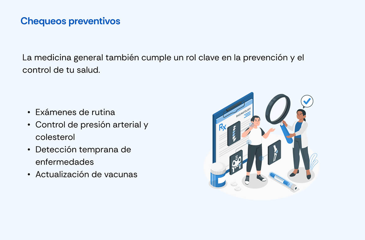 La medicina general tiene un rol clave en la prevención y el cuidado de la salud a lo largo del tiempo. A través de la consulta, el médico general puede ayudarte a identificar riesgos, prevenir enfermedades y acompañarte en decisiones importantes para tu bienestar, incluso cuando no presentas síntomas.