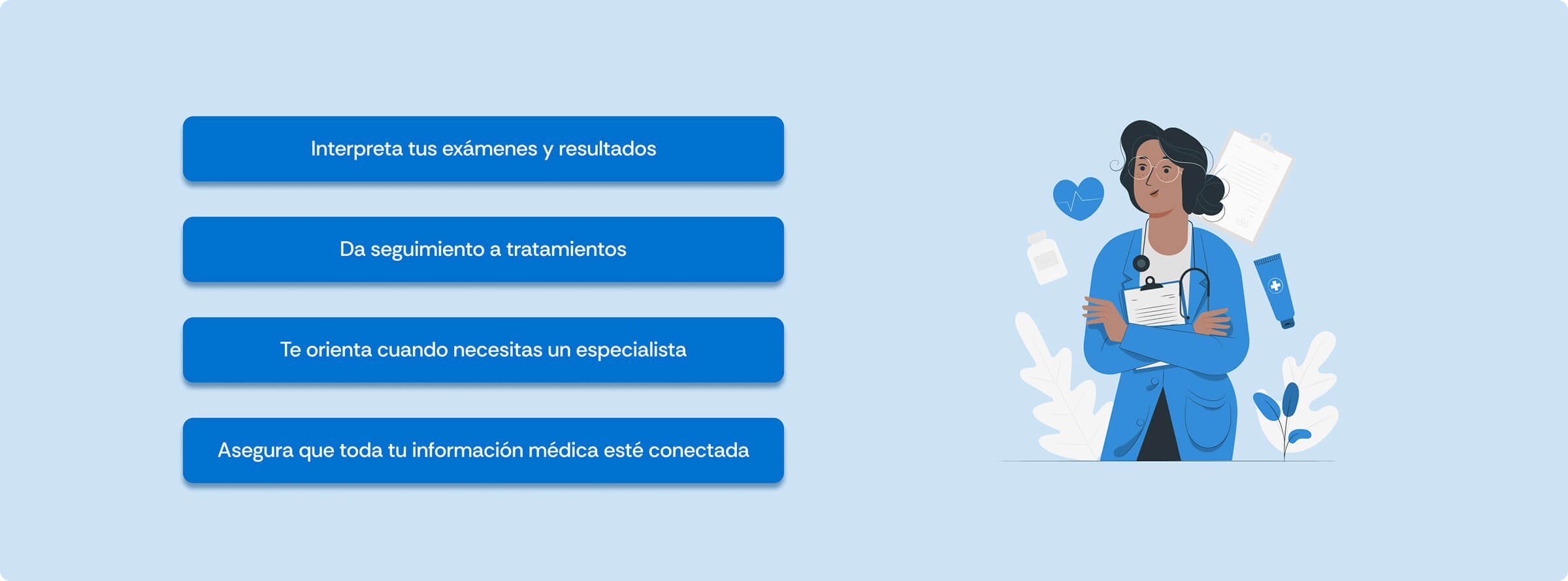 Contar con un médico general de confianza te permite recibir una atención continua y personalizada, basada en tu historia clínica y tus necesidades reales de salud.