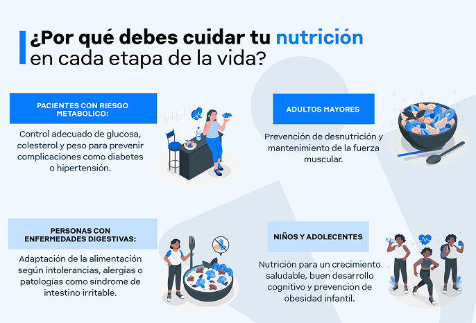 - Niños y adolescentes: apoyo en crecimiento, desarrollo y prevención de obesidad infantil.