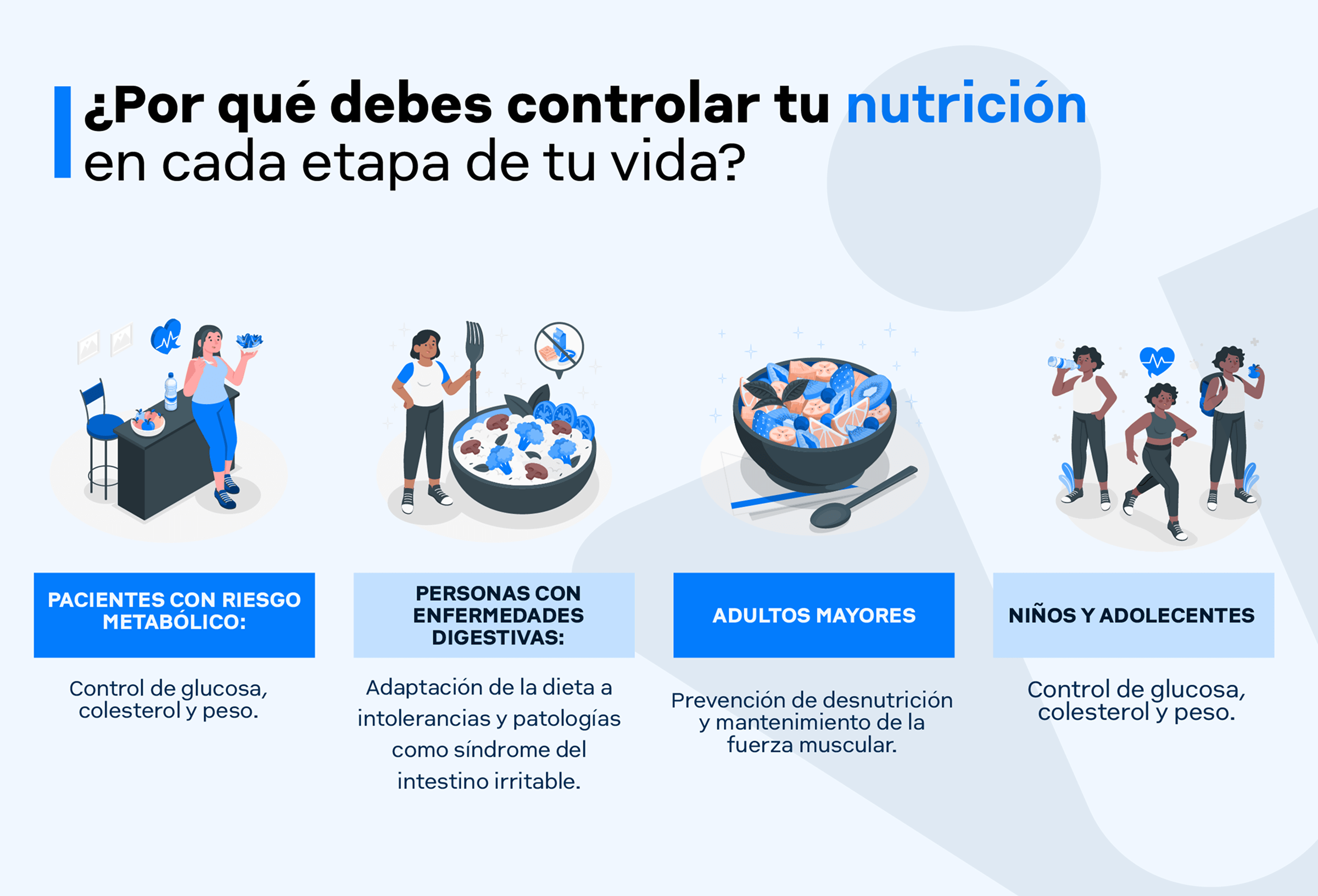 - Pacientes con riesgo metabólico: control de glucosa, colesterol y peso.